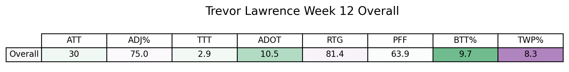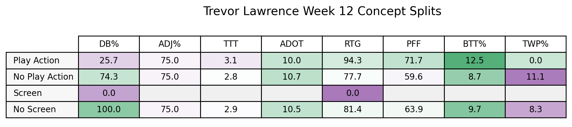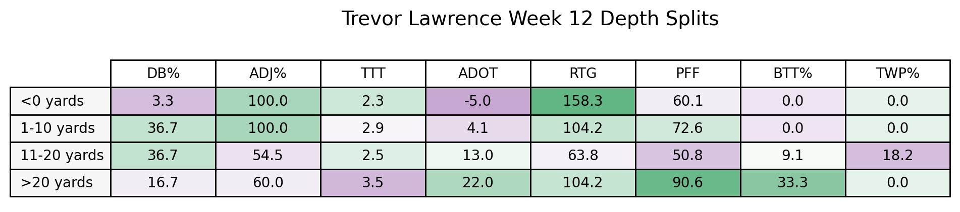 As you'll discover, this column has had a bit of a facelift. Rather than reviewing Lawrence's tape and stats on a binary level (good plays vs bad plays) we're going to take it a step further. Now, you'll find multiple charts showing Lawrence's stats in various passing splits. I'll be picking and choosing which charts to add written context and film clips.