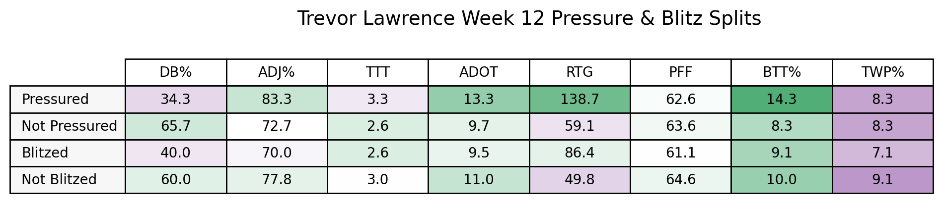 His traditional passing numbers against the blitz in this game: 7-for-11 for 78 yards, 3 touchdowns, 1 interception, and 1 fumble lost. Lawrence also took 2 sacks and had 1 scramble, which went for a first down.