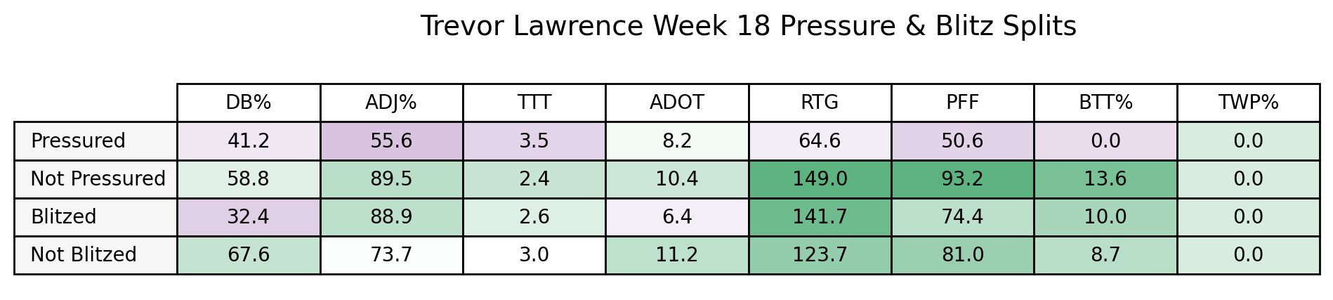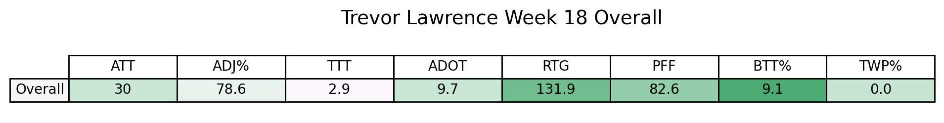 - Lawrence continues to stack strong performances. He ranked second in passer rating, third in big-time throw rate, and fourth in PFF grade among all quarterbacks in Week 18.